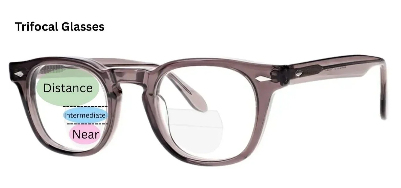 Trifocals: Lenses with three separate sections for distance, intermediate, and near prescriptions with distinct lines between the various prescription powers. Trifocals come in a variety of styles, such as flat top/D-segment, full width, and overhead, to best suit each user's lifestyle but all options have noticeable separate sections.