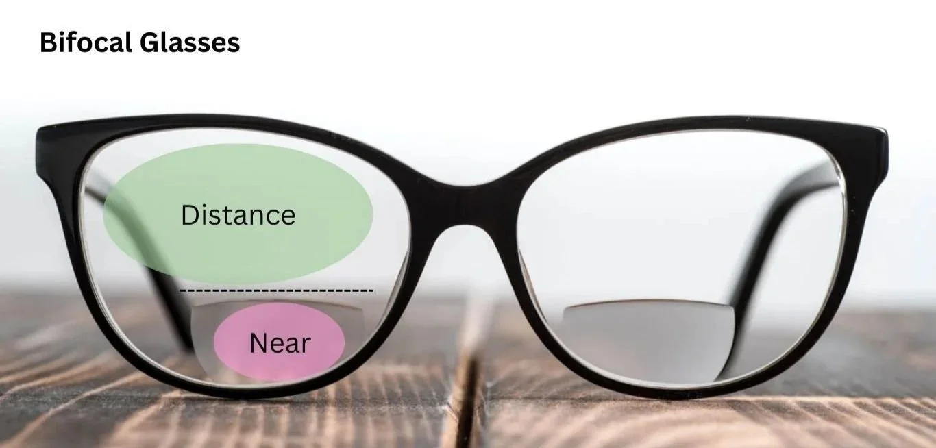 Bifocals: Lenses with two separate sections for your distance and near (reading) prescriptions, with a distinct line between the different prescription powers.